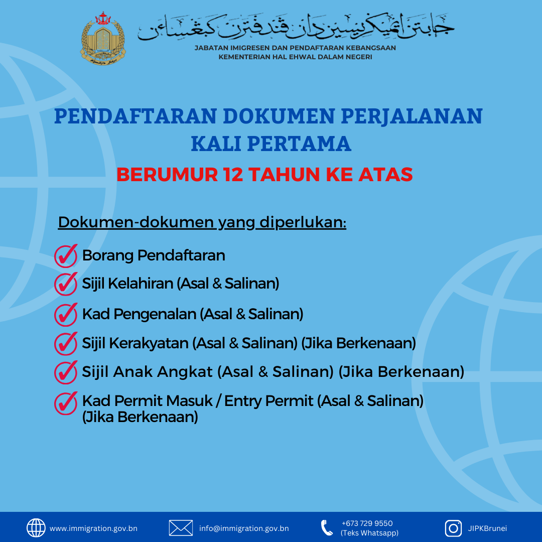 - Pendaftaran Dokumen Perjalanan Kali Pertama di Negara Brunei Darussalam bagi yang berumur 12 tahun ke atas