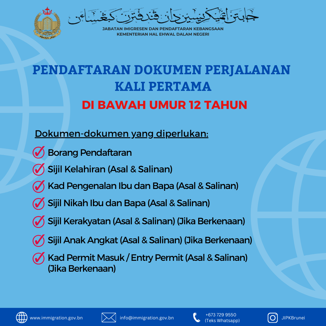 - Pendaftaran Dokumen Perjalanan Kali Pertama di Negara Brunei Darussalam di bawah umur 12 tahun