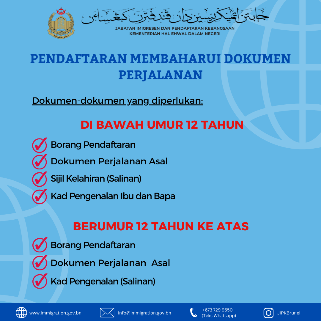 - Pendaftaran Membaharui Dokumen Perjalanan di Negara Brunei Darussalam bagi yang berumur 12 tahun ke atas